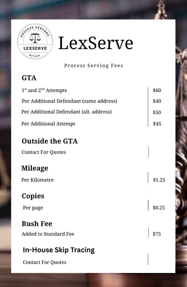 Serving legal documents throughout the Greater Toronto Area and select surrounding areas with care and reliability.